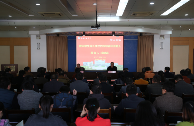 曲建武以“做大学生成长成才的指导者和引路人”为题,从“要爱国,忠于祖国,忠于人民”、“要励志,立鸿鹄志,做奋斗者”、“要求真,求真学问,练真本领”、“要力行,知行合一,做实干家”等四个方面阐释了大学应该培养什么人、怎样培养人的问题。他指出,大学生成长成才是合力育人的结果,人人都育人、时时都育人、处处都育人、事事都育人,思想政治教育工作要融入教育教学全过程,要遵守学生身心成长规律,让大学生形成正确价值观。
