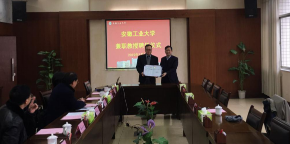 魏先文为董洪标颁发安徽工业大学兼职教授聘书,并希望通过与董洪标的合作,使更多的教师、学生在莱斯特大学和安徽工业大学这两个平台中获益,进一步提升研究生的培养质量和学院的整体学术水平。