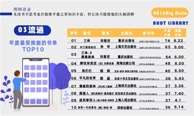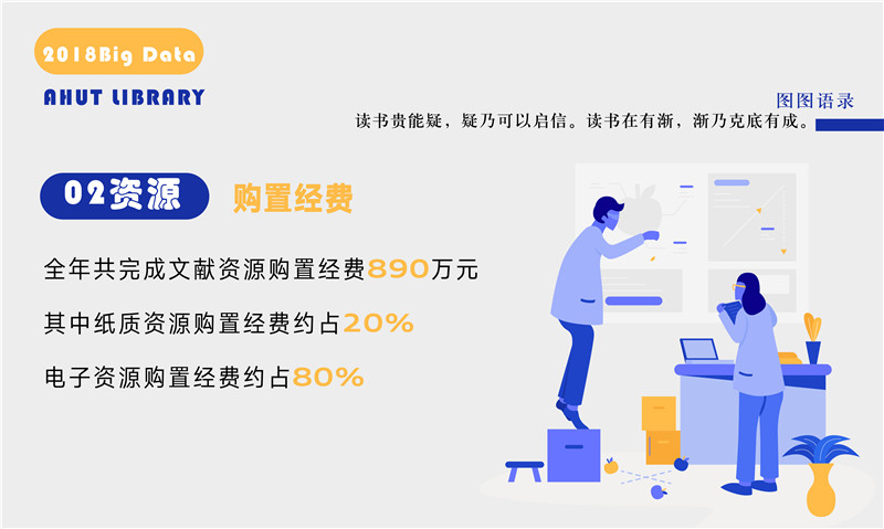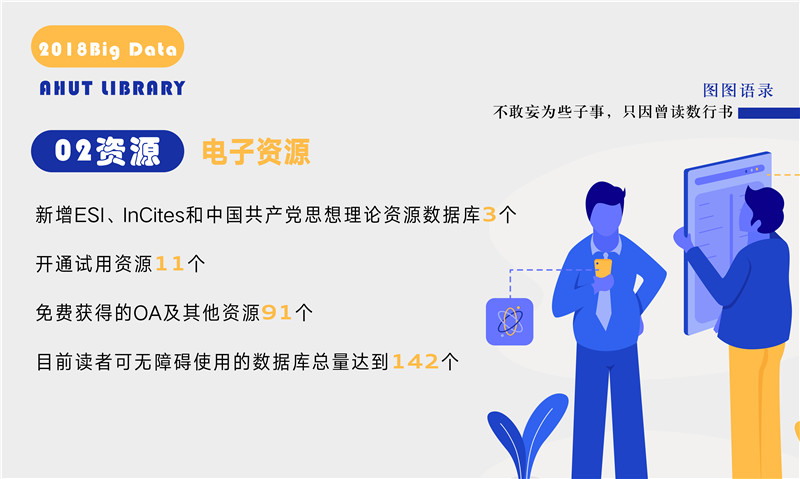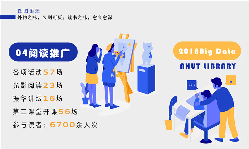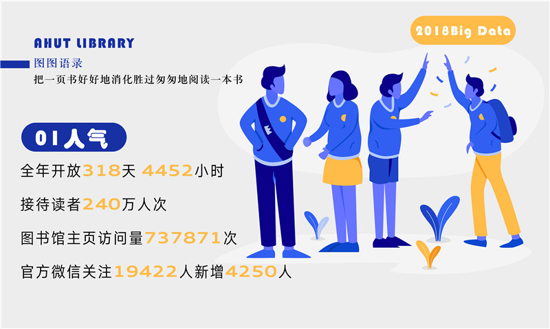 图书馆近日发布2018年度大数据,以图文方式直观形象地展示了图书馆一年来的人气、资源、读者服务、阅读推广、信息素养教育等整体状况。此次是图书馆连续第四次发布年度大数据。