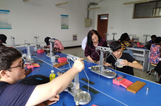 第三节课后,顾明言一行随即赶到逸夫楼506、507教室,随堂察看数理科学与工程学院唐绪兵、丁成祥两位老师指导的《大学物理W1》实验操作课。正在进行物理实验的是我校2018级全英文授课制药工程和软件工程两个本科班的留学生,在两位老师英文讲解与指导下,留学生实验操作井然有序。