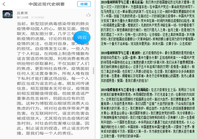 2019级材料科学与工程1班学生刘玲:此次疫情防控中,最令我震撼的是党的强大的组织动员能力,全国一盘棋,集中力量办大事!正如老师所言,中国共产党的领导是中国特色社会主义制度的最大优势!多难兴邦,我们从来不曾畏惧困难,我们始终拥有必胜的信心,这源于五千年连绵不断的文明!疫情是一面镜子,照见了真正的中国,也反射了人民群众的担当,在这里,我们看到许许多多美丽的逆行者、志愿者、捐赠者以及宅家者。身处于这样有爱暖心的国度,我内心最真实的感受是爱国,是我们最大的担当。