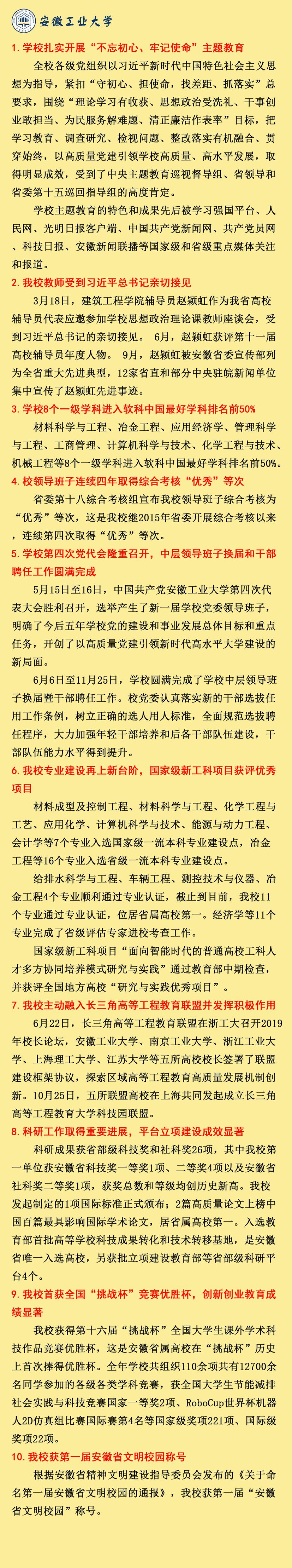 我校2019年“十件大事”评选结果于近日揭晓。2019年12月3日,校工会、党委宣传部向全校征集2019年“十件大事”候选题并开展投票评选工作,截至2020年4月15日,共有1833名教职工参与投票。经统计排序并报学校党委常委会研究,最终确定2019年“十件大事”。