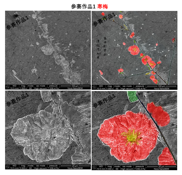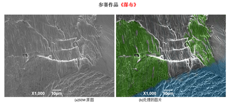 两幅作品都来源于学生科研创新活动中的发现,展示了先进钢铁材料美轮美奂的微观世界,让人领略了钢铁材料的艺术之美。材料学院学生方良伟和章红艳的参赛作品《瀑布》,为先进奥氏体耐热钢试样疲劳断口形貌扫描电镜照片,在疲劳载荷下形成的台阶状疲劳条带形似瀑布飞流直下三千尺。冶金工程学院学生赵伟和留学生Naqash Ali的参赛作品《寒梅》,为新炼钢技术调控中碳钢凝固组织的照片,在晶界形成了多种形貌恰似大雪纷飞中盛开的梅花。