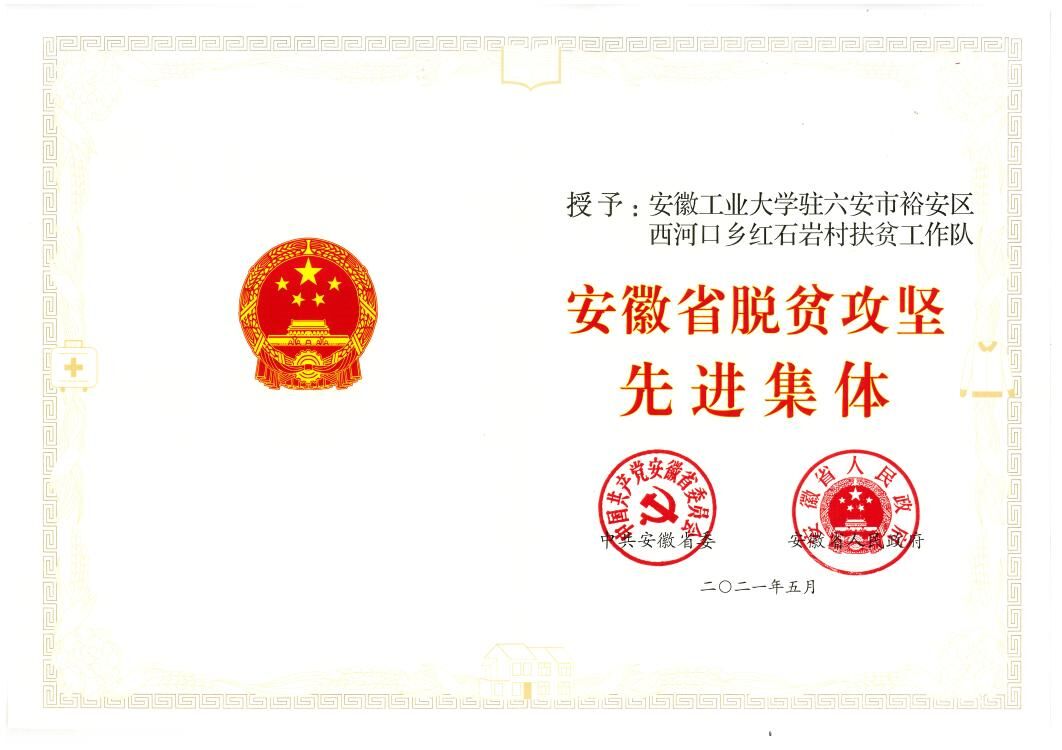 近日,全省脱贫攻坚总结表彰暨巩固拓展脱贫攻坚成果同乡村振兴有效衔接工作推进大会在合肥举行,省委、省政府隆重表彰全省脱贫攻坚先进集体和先进个人。我校驻六安市裕安区西河口乡红石岩村扶贫工作队荣获“安徽省脱贫攻坚先进集体”荣誉称号。