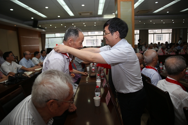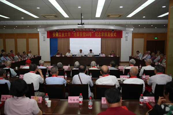 祖明在仪式上宣读了安徽工业大学“光荣在党50年”纪念章获颁人员名单,我校共有87名老党员获此殊荣。刘新跃、魏先文、祖明向“光荣在党50年”的老党员颁授并佩戴纪念章。