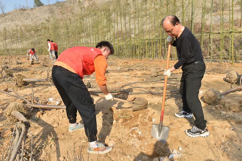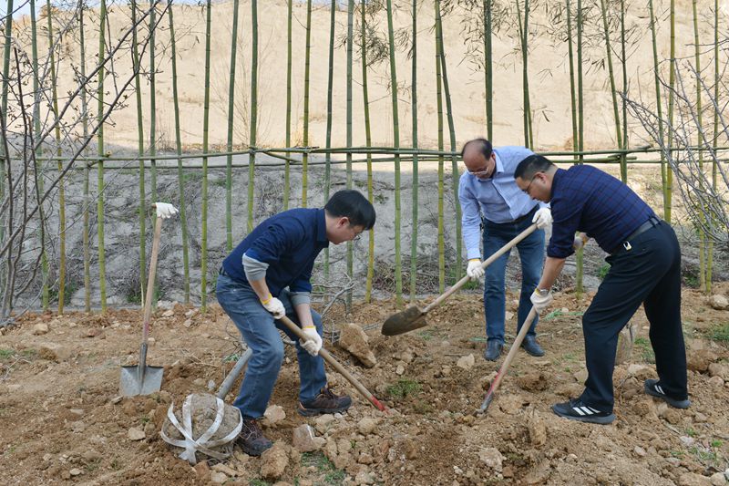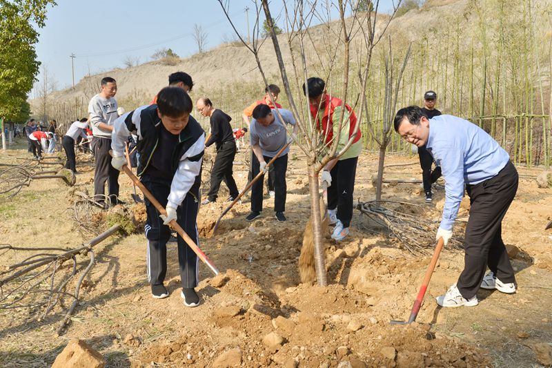 植树现场一派繁忙有序、热火朝天的景象。党员干部与师生代表二人一组,分工合作,挥锹铲土、扶放树苗、填土夯实,样样做得认真到位,个个忙得不亦乐乎,为绿色校园又增添了一片充满生机和希望的新绿。