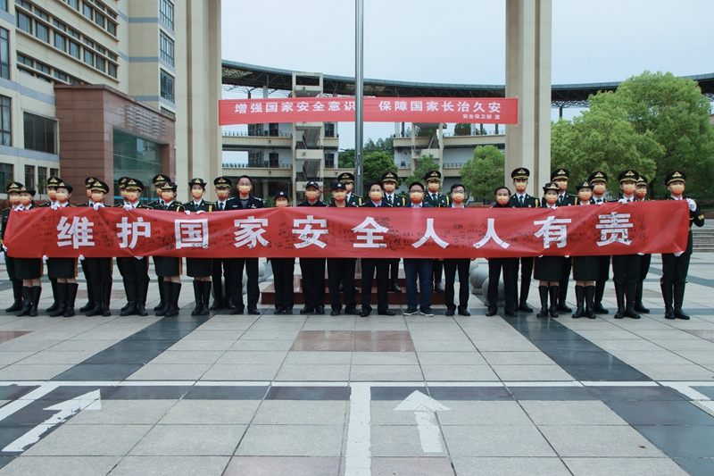 升旗仪式后,师生参观了国家安全知识展板,在“国家安全人人有责”横幅上签名。