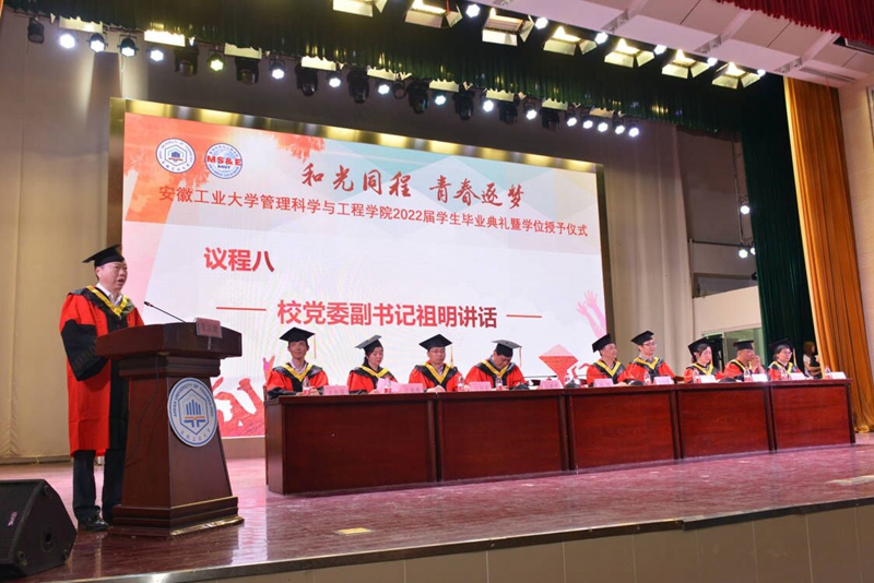 祖明代表学校向毕业生们致以最诚挚的祝贺,对辛勤付出的全体教职工表示感谢。祖明对同学们在学风建设、科技创新、实践服务、疫情防控、就业创业等方面取得的成绩和付出的努力表示充分肯定,寄语同学们在未来的青春赛道上,要胸怀“国之大者”,勇担复兴重任;要铭记“崇德向善”,彰显昂扬风貌;要矢志“砥砺奋斗”,不负青春韶华。