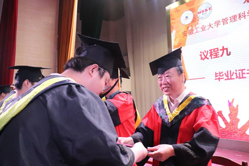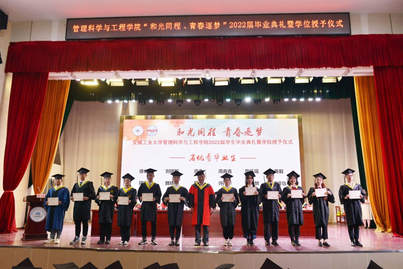典礼在庄严雄壮的国歌声中拉开序幕。院党委书记汪春胜宣读了2022年安徽省普通高校品学兼优毕业生名单、2022年安徽工业大学优秀毕业生名单、2022届校友联络员名单。参加典礼的领导老师为优秀毕业生颁发荣誉证书,为校友联络员颁发聘书。