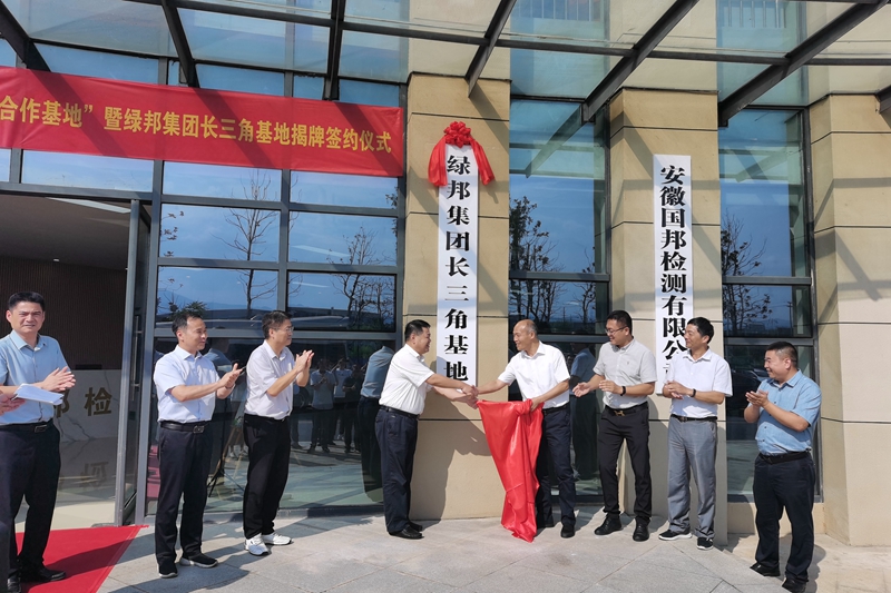 凤杰与陈旭为绿邦环境集团安徽国邦检测有限公司“产学研合作基地”揭牌。