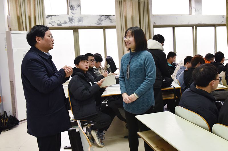 祖明选听了公共管理与法学院王逸飞老师的《法理学》和外国语学院范雯丽老师的《大学提高英语》,顾明言选听了体育部范雪老师的《体育2-太极拳》和邹正华老师的《体育2-排球》,刘明选听了公共管理与法学院韦子平老师的《企业行政管理》,水恒福选听了能源与环境学院邱冰冰老师的《流体力学》,王先柱选听了外国语学院凌海青老师的《大学提高英语》,曾杰选听了化学与化工学院刘姿老师的《免疫学》。课间,校领导与师生就课堂教学内容安排、师生互动及课堂教学效果进一步提升进行了交流。
