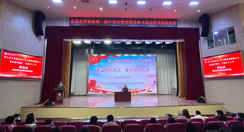 2月24日下午,2023年学校首场“英模·大师”进校园专题报告会在秀山校区新大学生活动中心举办。马鞍山市公安局科技信息化支队支队长、我校首批兼职辅导员及思政课教师周克武作了“勇立时代潮头,争做时代先锋”主题报告。各学院辅导员、本科生、研究生代表近500人聆听了报告。