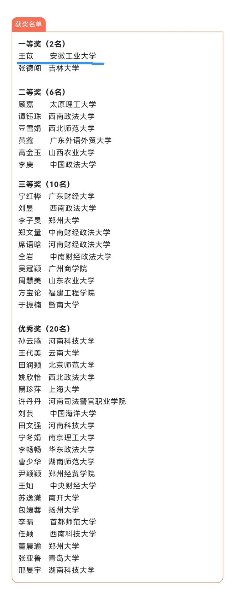 比赛收到来自吉林大学、暨南大学、南开大学、中国政法大学、西南政法大学、华东政法大学等近400所境内外高校的有效作品1643份,经过网上投票、大赛组委会初评,共选出360份作品进入终赛。来自武汉大学、山东大学、河南省高级人民法院、河南省人民检察院等实务界与理论界的30余名专家学者参加终评,最终评出一等奖2名、二等奖6名、三等奖10名、优秀奖20名。