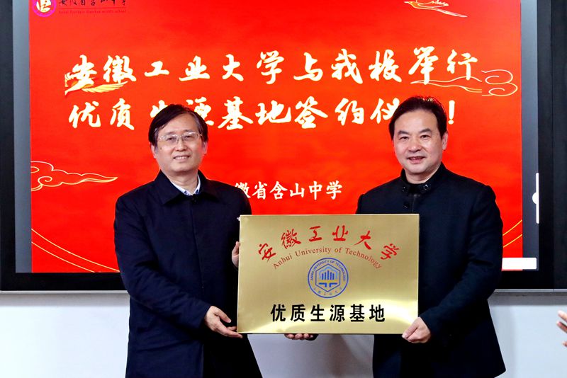 魏先文代表学校向含山中学授予“安徽工业大学优质生源基地”牌匾,与含山中学签署了优质生源基地建设合作协议,送上2021-2022学年度我校含山中学校友喜报。