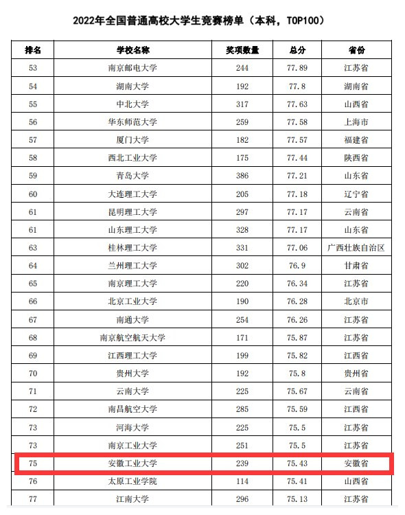 3月22日,中国高等教育学会发布《2022年全国普通高校大学生竞赛分析报告》,我校在2022年全国普通高校学科竞赛榜单(本科,TOP100)中位列安徽省第2位,全国第75位。