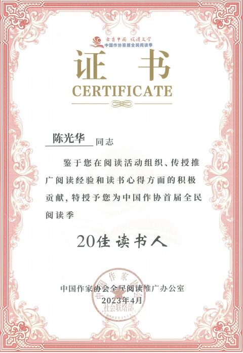 近日,“书香中国·文学有我”的中国作协首届全民阅读季活动评奖结果公布,颁授“全民阅读推广城市”“最佳读书人”“最佳藏书人”“最佳图书馆”“最佳书店”各20个。我校图书馆陈光华老师获评“中国作协首届全民阅读季20佳读书人”。