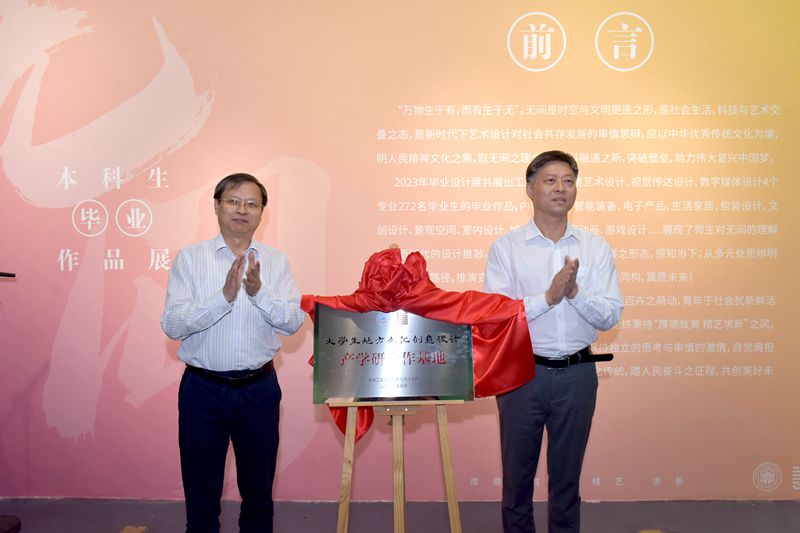 仪式上,艺术与设计学院党委书记张为清致欢迎辞,校友代表、学生代表分别作了交流发言,与会嘉宾为优秀毕业设计作品颁奖。何俊与校党委常委、党委宣传(统战)部部长黄勇共同为大学生地方文化创意设计产学研合作基地揭牌。