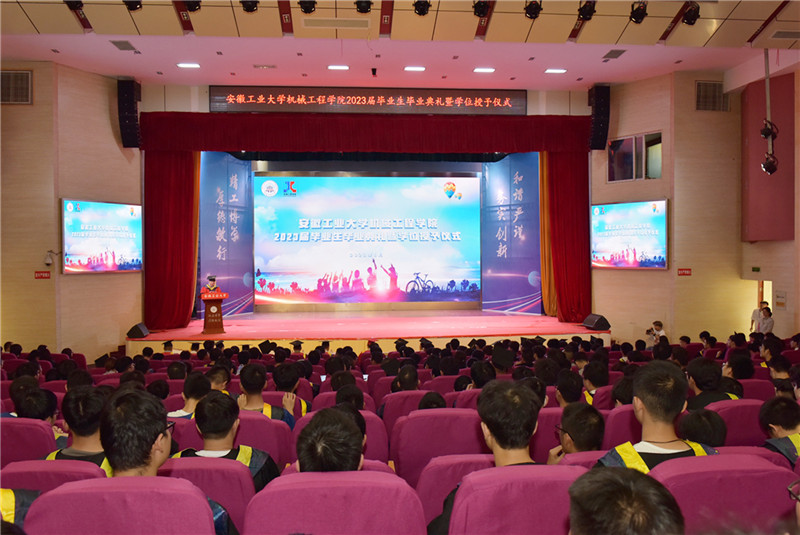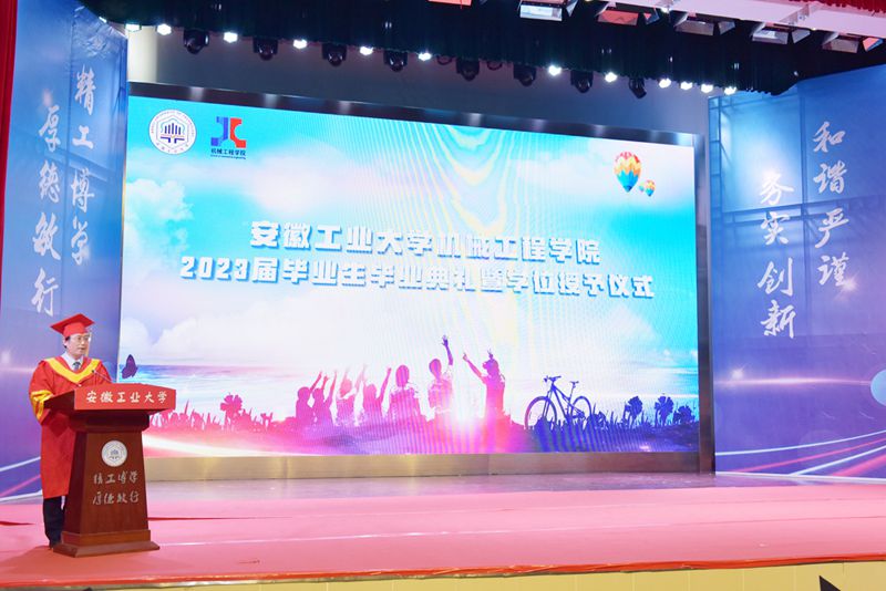 魏先文代表学校向圆满完成学业的毕业生表示祝贺,对机械工程学院2023届毕业生在思想引领、争先创优、科技创新等方面取得的优异成绩表示肯定。他以“踔厉奋发展风采,笃行不怠向未来”为题,寄语全体毕业生要以担当践行使命,争做“眼里有光”的开拓者,将自己的职业理想、学业理想和人生目标,同祖国的前途、民族的命运紧密联系在一起,主动担苦、担难、担重、担险,将安工大人的家国情怀和历史担当,浓墨重彩地写进中国式现代化的壮丽篇章。要以吃苦成就事业,争做“肩上有责”的奋斗者,学会运用习近平新时代中国特色社会主义思想的世界观和方法论,深刻领会“六个必须坚持”,精于工、匠于心、品于行,在立足本职的创新创造中不断积累经验、取得成果,成长为一专多能的复合型人才。要以感恩回馈社会,做“心中有爱”的奉献者,树牢正确的世界观、人生观和价值观,践行社会主义核心价值观,坚守道德底线和法纪红线,清白做人、干净做事,摆正个人与团队的关系,对单位和家庭尽责,心系母校、奉献国家。