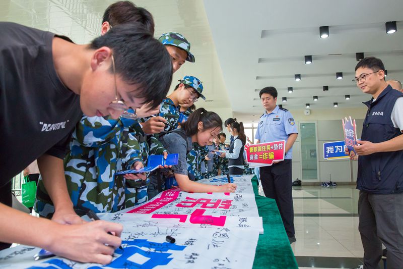 课前现场举行了打卡和签名活动,师生纷纷在“防电诈、拒毒品,从我做起”横幅上签名,手持卡通宣传展板打卡朋友圈。(撰稿:李晓山 韩仁海 审核:包恒庆 田继兵 张苒 王菁)
