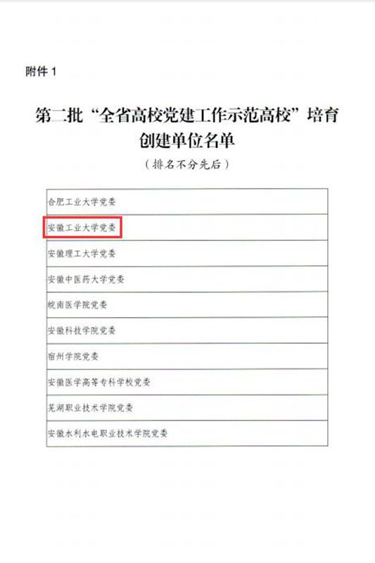近日,安徽省委教育工委公布第二批全省党建工作示范高校、标杆院系、样板支部培育创建单位评审结果,学校党委入选“全省党建工作示范高校”培育创建单位。