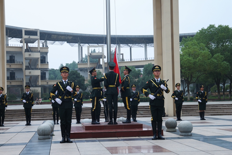 清晨七时整,校国旗护卫队迈着坚定有力的步伐,整齐划一地护卫着鲜艳的国旗。伴着庄严的国歌声,五星红旗冉冉升起,迎风飘扬。观礼师生全体肃立,向国旗行注目礼。