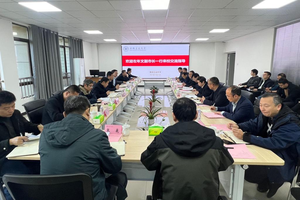 魏先文对左年文一行来校调研表示欢迎,对市委市政府长期以来关心支持学校建设发展表示感谢。魏先文介绍了学校深入学习贯彻习近平总书记关于教育、科技、人才工作的重要论述和习近平总书记考察安徽的重要讲话指示精神,聚焦培育时代新人和服务重大需求主题,奋力支撑实现高水平科技自立自强,全力服务创新型省份和创新型城市建设,走出一条“以工为主、服务行业、融入地方、创新发展”特色发展之路的情况,表示学校将持续推进与市委市政府有关工作的互动与互融,为地方经济和社会发展作出新的更大贡献。