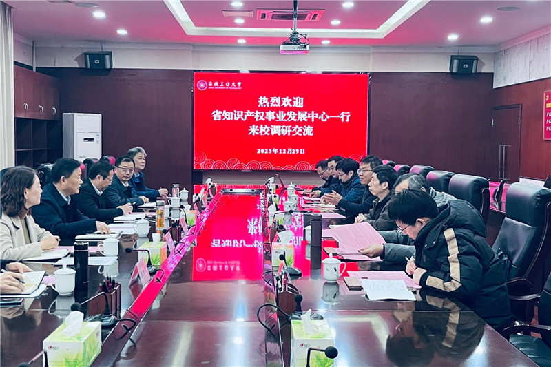 12月29日上午,安徽省知识产权事业发展中心主任吴建中一行来校调研。校党委常委、副校长水恒福出席,科研处、工程研究院负责人,相关学院、研究机构教授代表,马鞍山市市场监督管理局相关负责人参加。