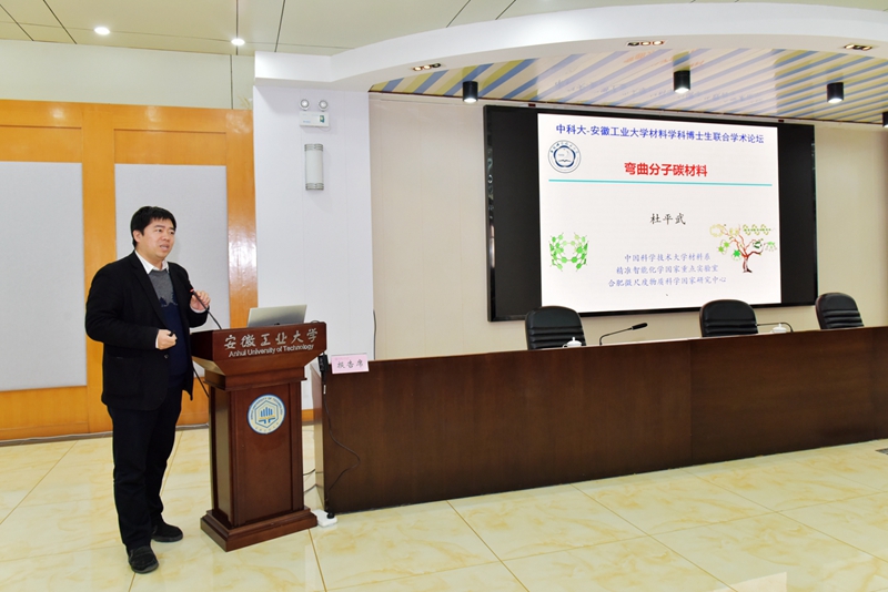 1月14日,首届中国科学技术大学—安徽工业大学材料学科博士生联合学术论坛在我校佳山校区学术会议中心举行。校党委常委、副校长水恒福,中国科学技术大学材料系党总支书记朱彦武出席论坛开幕式。两校材料学科博士生以及导师参加论坛开幕式。我校研究生院(研究生工作部)常务副院长(部长)、学科建设处处长张世宏主持开幕式。