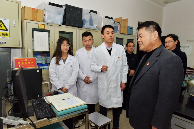 在冶金工程学院,陆林重点考察了有色金属冶金系战略金属党员先锋攻关创新团队实验室,深入了解团队在镓、锂、铍、铼及铂族金属等战略金属方面的关键技术和产品攻关情况,鼓励团队成员充分发挥党员的先锋模范作用,积极面向国家重大战略需求开展创新性研究,力争突破当前该领域的卡脖子难题,在强国建设、民族复兴伟业中展现工大人的使命担当。