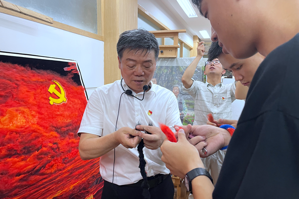在丝画馆的创作室里,一面正在创作的独特党旗吸引同学们的眼球,气势磅礴的红色祥云上方金黄的镰刀铁锤格外醒目。袁洪滨从这面党旗下方的南湖游船切入,亲手教授同学们丝画的手工搓、拉、捻、剪的制作技术,带领同学们重温了中国共产党百年波澜壮阔的发展史,嘱咐同学们要传承和发扬好中华优秀传统文化,从平凡的事物中发现美、创造美。