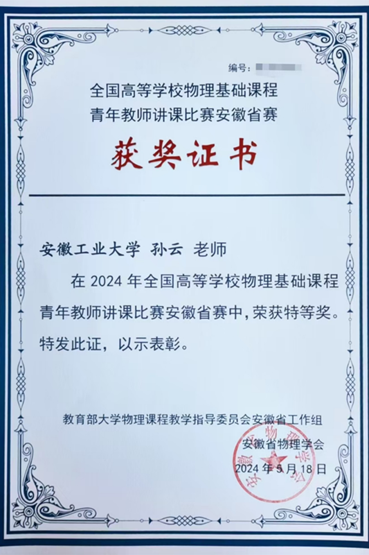 5月16至18日,2024年全国高等学校物理基础课程青年教师实验教学讲课比赛省赛在安庆师范大学举行。经过激烈的角逐,我校微电子与数据科学学院教师孙云凭借出色的表现获特等奖(第一名),并被推荐参加华东赛区复赛。