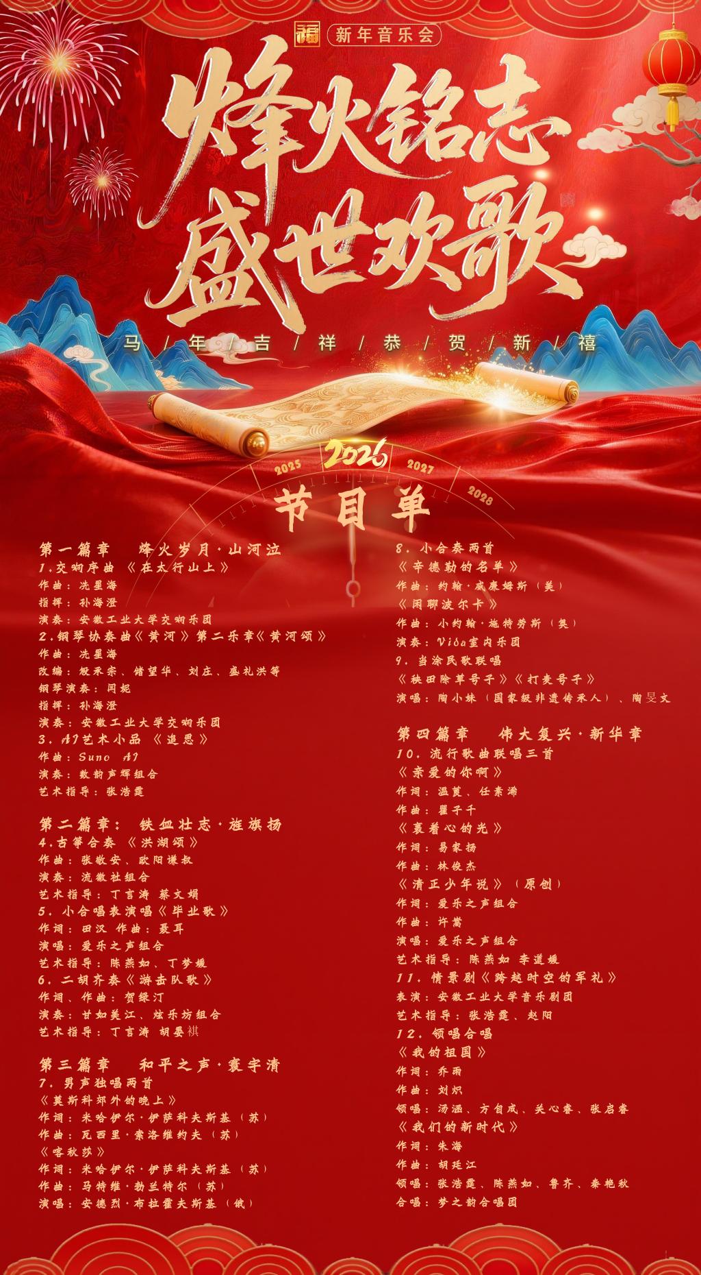 为纪念中国人民抗日战争暨世界反法西斯战争胜利80周年,用文艺宣演的形式积极营造健康高雅的校园文化艺术氛围,丰富师生精神文化生活,展示我校大学生美育教育成果,特在新年来临之际,举办安徽工业大学美育教育成果汇报演出暨“烽火铭志·盛世欢歌”2026新年音乐会。